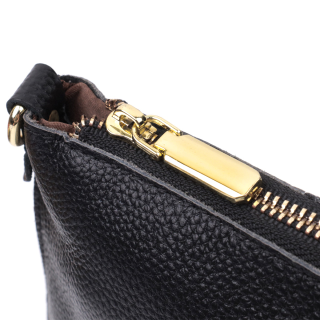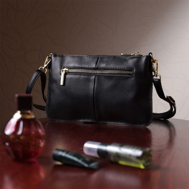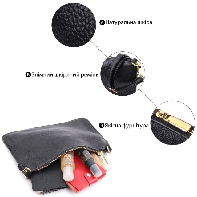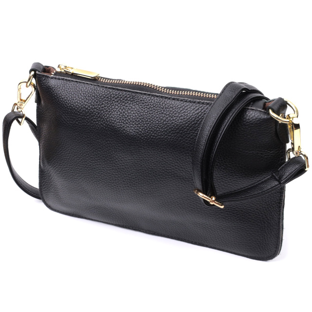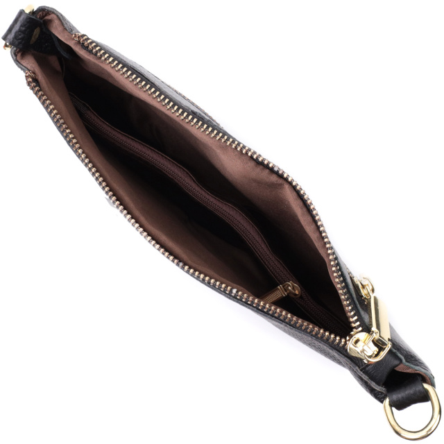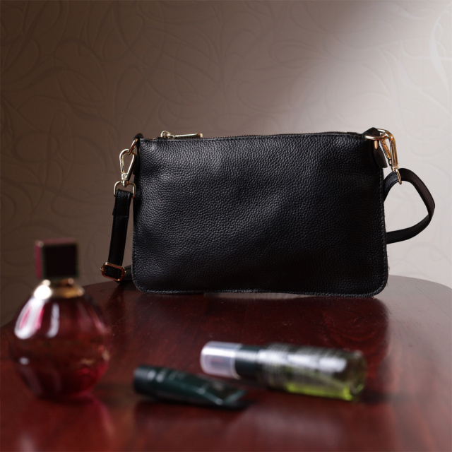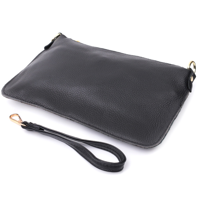 Интересная женская функциональная сумка-клатч из натуральной кожи. Аксессуар состоит из основного отделения, что закрывается на молнию, кармана-перегородки на молнии внутри и кармана на молнии на тыльной стороне, снаружи. Носить сумку можно на плече и через плечо, также можно носить как клатч под рукой и на кисти, для этого имеется длинный съемный ремешок, а также съемный кистевой ремень.