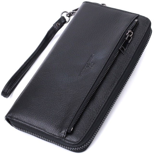 Вместительное и практичное мужское портмоне-клатч из высококачественной кожи черного цвета для уверенного в себе мужчины. Имеет все необходимое, чтобы стать Вам незаменимым аксессуаром в повседневной жизни. Вы с легкостью поместите в него бумажные купюры, телефон, монеты, документы и карточки. Этот клатч можно носить как в сумочке или портфеле, или просто как самостоятельный аксессуар на запястье при помощи кистевого ремешка, или же просто в руке с помощью ручки, которая находится на тыльной стороне. На лицевой стороне, посередине, расположено тиснение с логотипом производителя, что является залогом качества изделия. Упакован аксессуар в белую плотную картонную коробку с фирменным логотипом. Если же Вы решите такой аксессуар подарить близкому человеку, то Вам гарантированно будут очень благодарны.