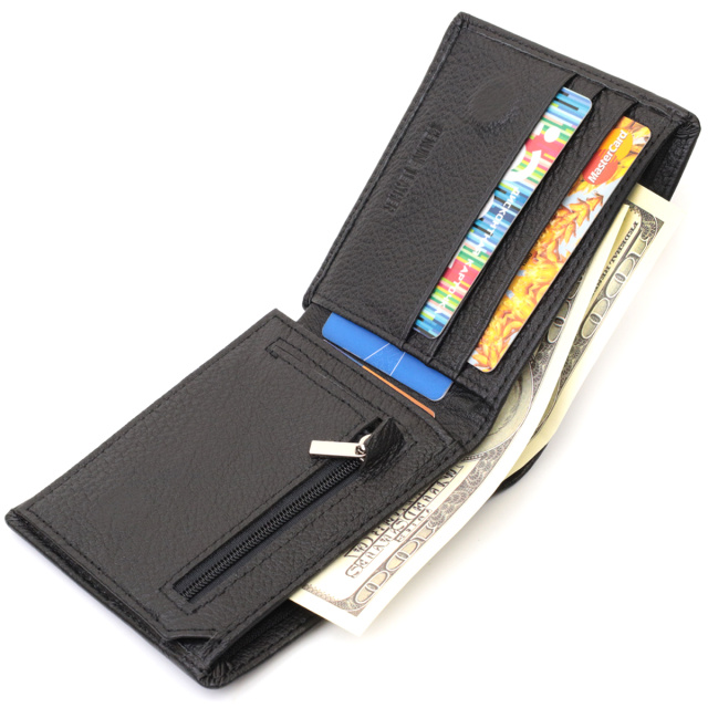 Практичный мужской кошелек горизонтального формата из натуральной качественной кожи. Модель имеет удобный размер и закрывается на магнит. Аксессуар внутри оснащен тремя отделениями для купюр, девятью ячейками для карт, двумя прилегающими карманами и карманом на молнии для монет. Упакован аксессуар в белую плотную картонную коробку с фирменным логотипом.