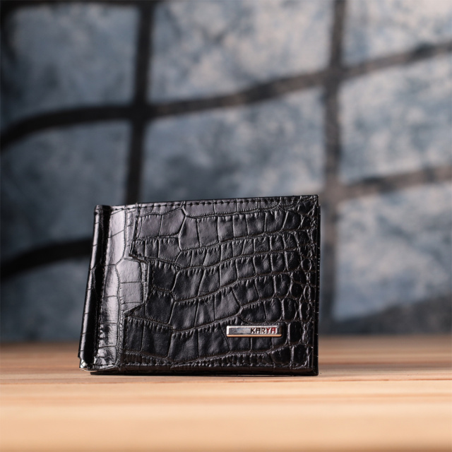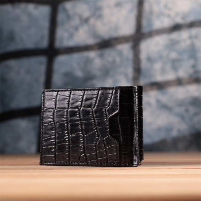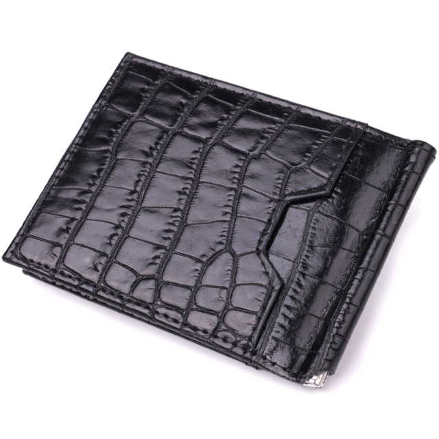 Отличный мужской зажим, из натуральной фактурной кожи, с тиснением под крокодила, в классическом черном цвете. Изделие очень компактно, но при этом купюры всех номиналов помещаются отлично. Необходимый кожаный аксессуар, который отлично подчеркнет стиль и статус своего владельца. Аксессуар упакован в фирменную коробочку. Изделия из натуральной кожи всегда будут отличным подарком для близкого человека.