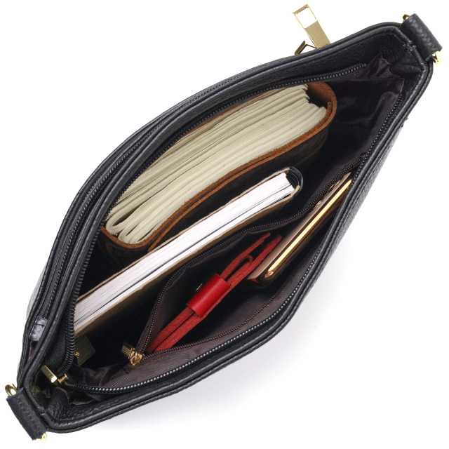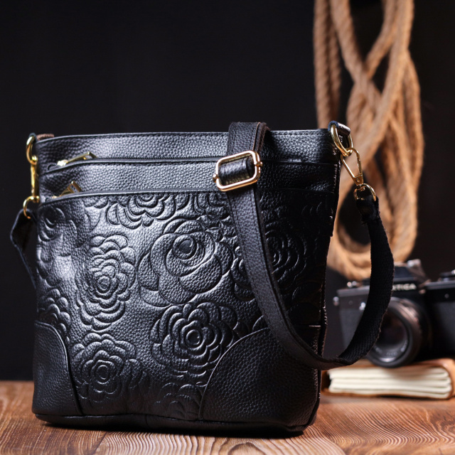 Стильная женская сумка среднего размера из натуральной высокопрочной кожи с цветочным тиснением. Имеет классический черный цвет и зернистую фактуру. Фурнитура выполнена в цвете под золото. Модель долгое время остается в идеальном состоянии, такую сумку приятно носить. Может быть отличным вариантом для подарка близкому человеку.