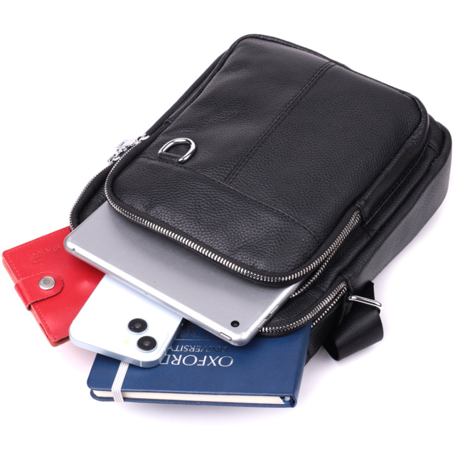 Удобная мужская сумка из натуральной кожи. Изделие выполнено из зернистой кожи черного цвета. Внутри аксессуара плотная текстильная подкладка черного цвета. Сумка будет вашим идеальным вариантом на каждый день. Модель очень удобная. Классический дизайн никогда не выйдет из моды. Такая сумка подойдет под любые вещи из вашего гардероба. Модель дополнена качественной фурнитурой в дизайн изделия.