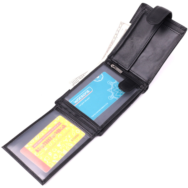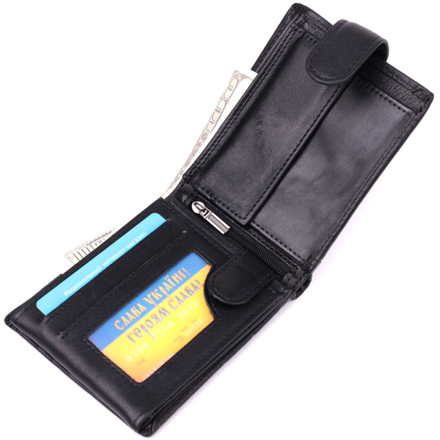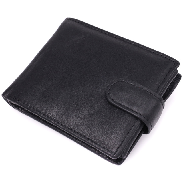 Простой бумажник в черном цвете для мужчин, которые любят и ценят классику. Портмоне закрывается на кожаный хлястик с кнопкой. Модель имеет практичный размер отменный функционал. Аксессуар упакован в тканевый пылезащитный чехол. Кошелек будет прекрасным и незаменимым подарком для любого мужчины.