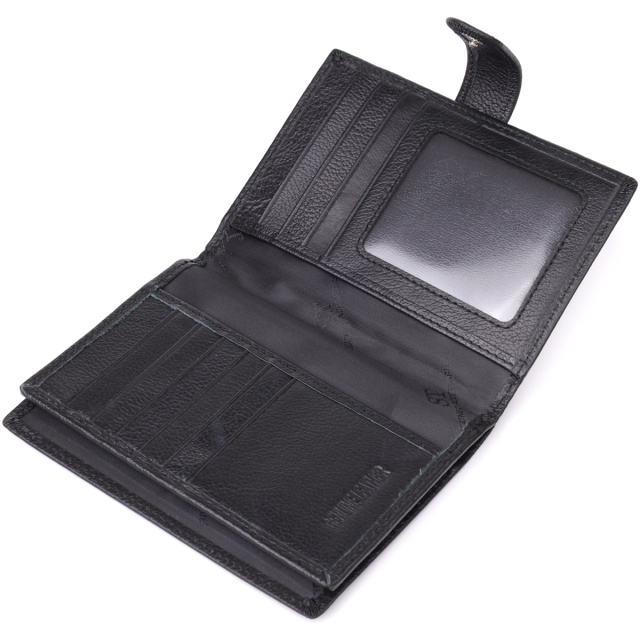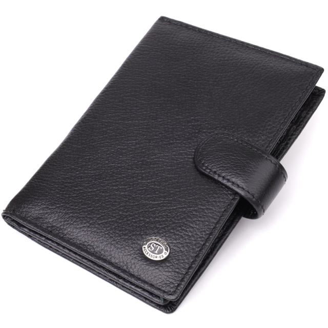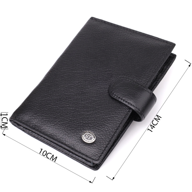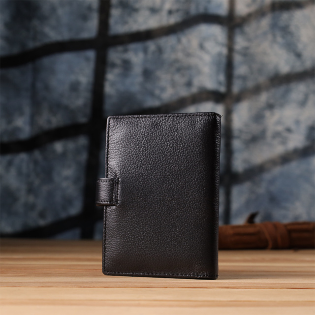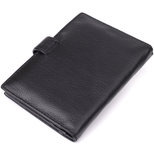 Обложка для документов и бумажник «два в одном» — универсальное и практичное решение для тех, кто ценит порядок, комфорт и элегантность в повседневных деталях. Выполненный в классическом двойном сложении и закрывающийся на хлястик с кнопкой, аксессуар обеспечивает надёжное хранение всех необходимых вещей. Изготовлен из натуральной чёрной кожи высокого качества — материала, который отличается мягкой текстурой, устойчивостью к износу и приятными тактильными ощущениями. Несмотря на компактные размеры, изделие очень вместительное внутри: оно легко вмещает документы, купюры, банковские карты и другие мелочи. Дизайн дополнен ровной декоративной строчкой по периметру и аккуратным фирменным логотипом в нижнем правом углу — лаконичный акцент, подтверждающий оригинальность и высокий уровень исполнения. Аксессуар поставляется в фирменной упаковке — стильной картонной коробке, что делает его отличным выбором в качестве подарка.