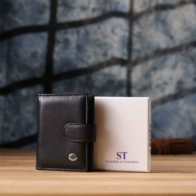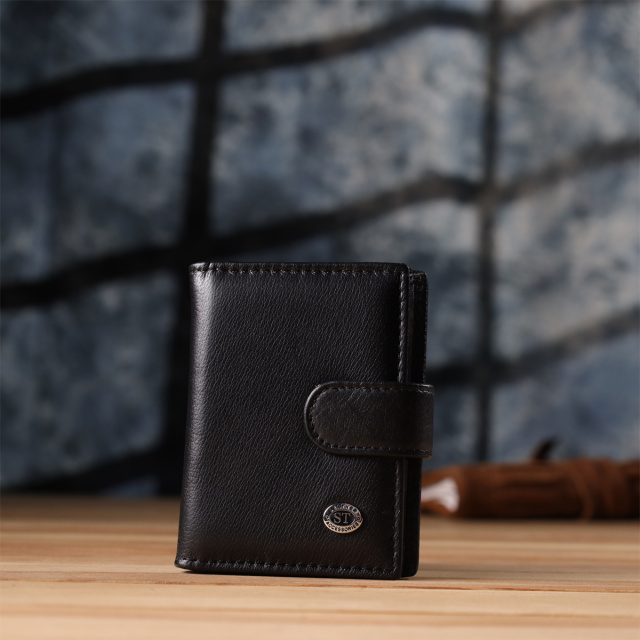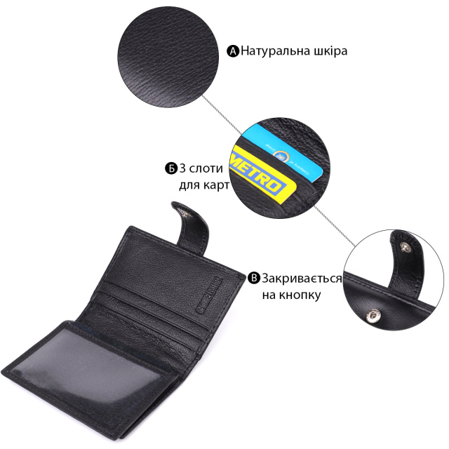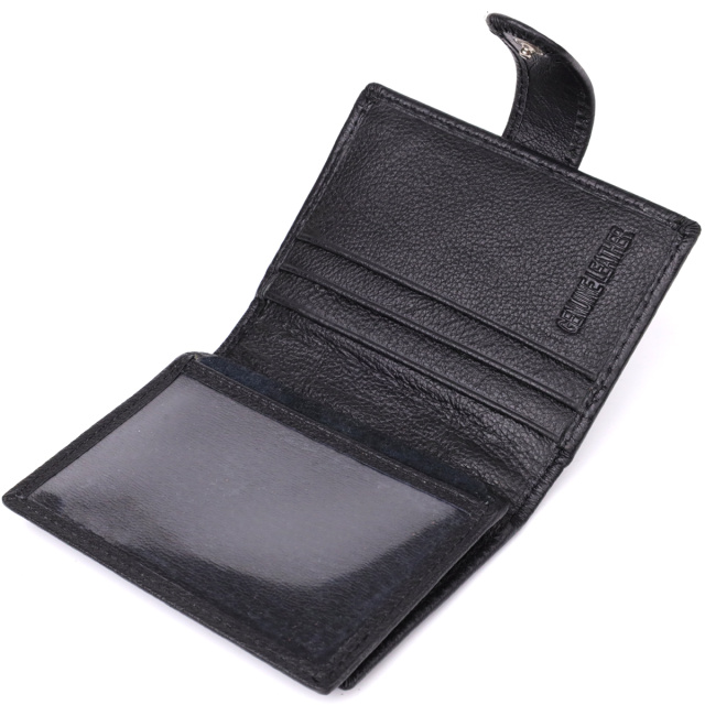 Мужской бумажник, что закрывается хлястиком на кнопку, в классическом двойном сложении — практичное и стильное решение для повседневного использования. Аксессуар выполнен из натуральной чёрной кожи высокого качества, приятной на ощупь и устойчивой к износу. Компактный снаружи, но вместительный внутри. Дизайн подчеркнут аккуратной ровной строчкой по канту, а в правом нижнем углу расположен фирменный логотип бренда — знак подлинности и безупречного исполнения.