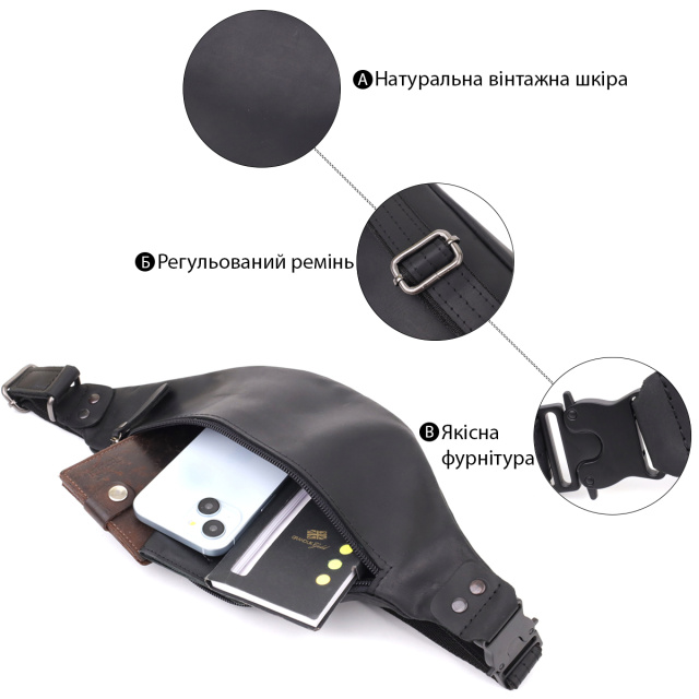 Мужская сумка-бананка из винтажной натуральной кожи в чёрном цвете — стиль, проверенный временем. Эта стильная мужская сумка-бананка от украинского бренда Shvigel выполнена из натуральной винтажной кожи, что придаёт ей характер и благородную фактуру. Благодаря качественной обработке кожа не только выглядит роскошно, но и обладает высокой износостойкостью — аксессуар прослужит долго, не теряя эстетического вида.
