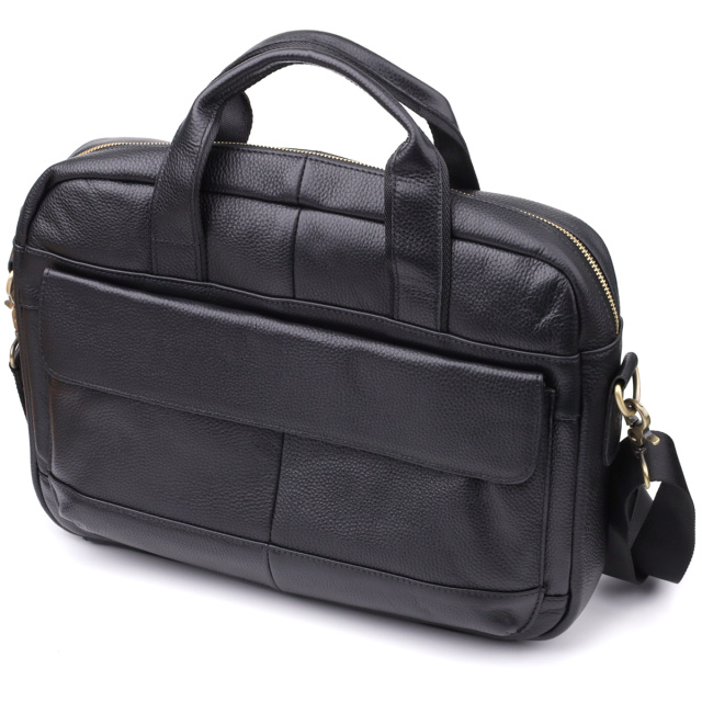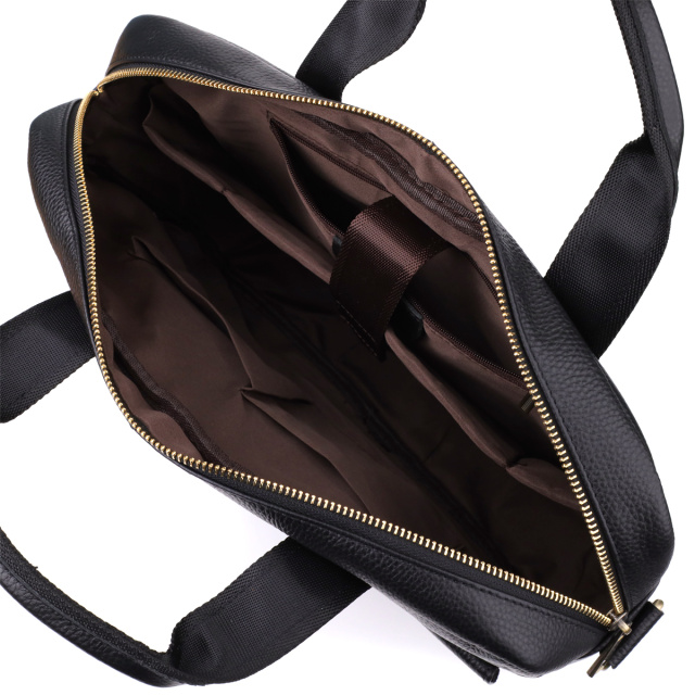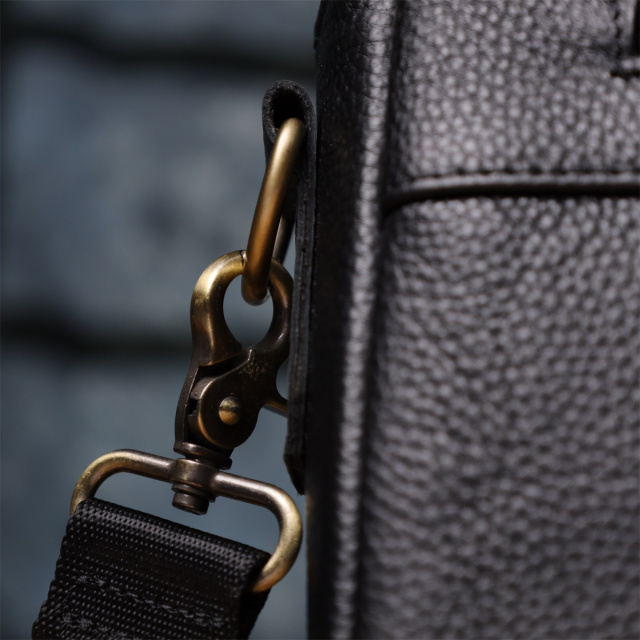 Фурнитура в оттенке "под латунь" придаёт модели благородный акцент и подчёркивает деловой характер. Для переноски предусмотрены две прочные кожаные ручки, а также съёмный регулируемый текстильный ремешок, который можно носить на плече или через плечо.
