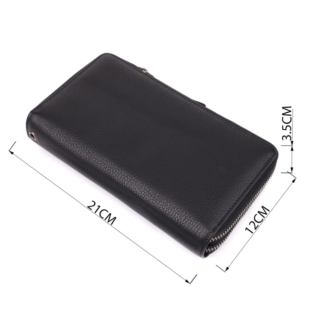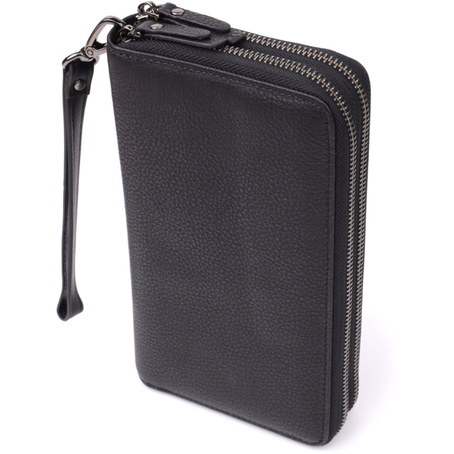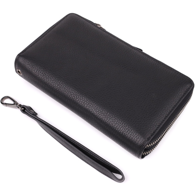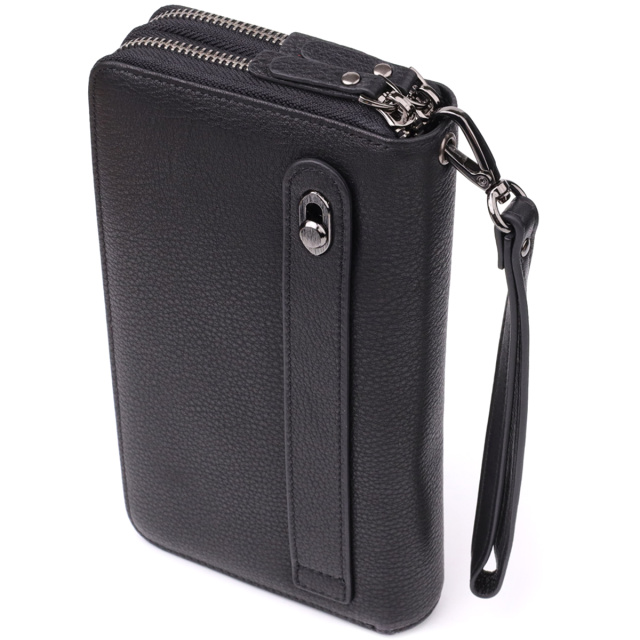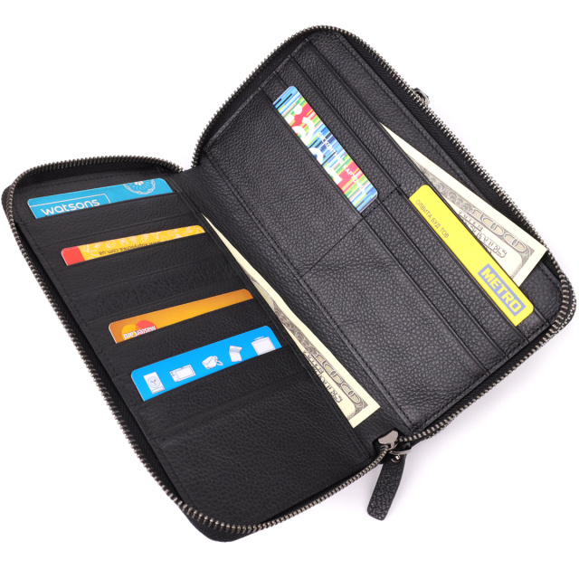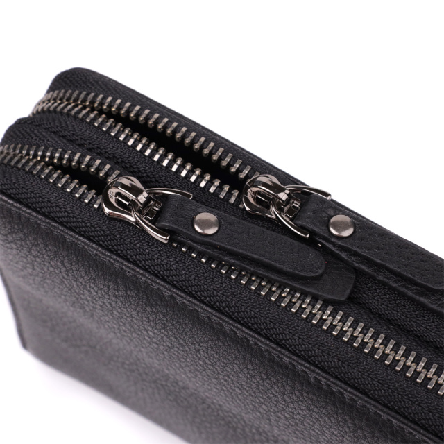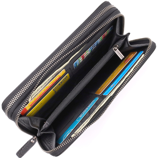 Модель состоит из двух самостоятельных отделений, каждое из которых закрывается на надёжную молнию. Внутри предусмотрены карманы для купюр, отделения на молнии для хранения ценных вещей, а также множество ячеек для пластиковых карт и документов. Такая структура позволяет удобно распределить содержимое и быстро находить всё необходимое.