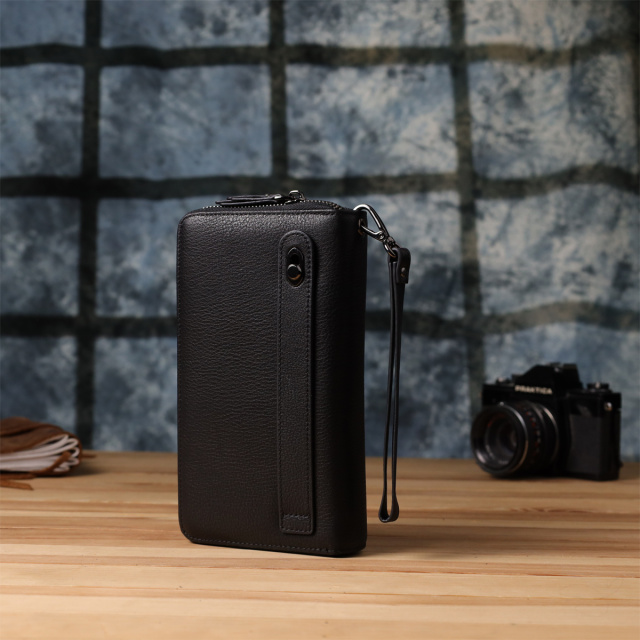 На тыльной стороне расположена кожаная ручка для комфортной переноски, а съёмный кистевой ремень позволяет носить клатч на запястье. Универсальный вариант как для деловых встреч, так и для повседневного использования.