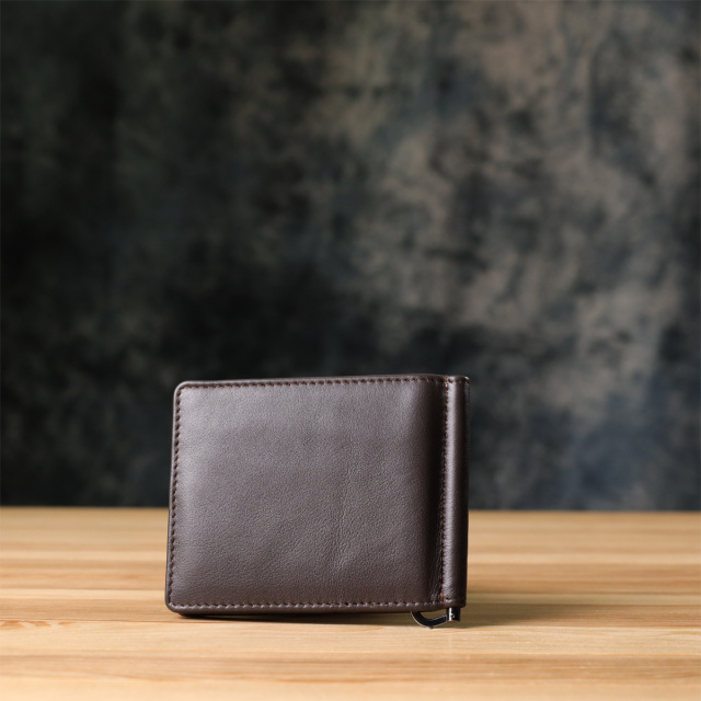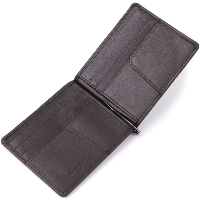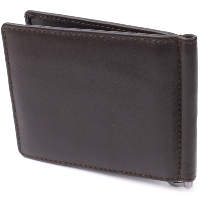 Аксессуар выполнен из натуральной гладкой кожи коричневого цвета. Внутри предусмотрены восемь слотов для карт и надежный металлический зажим для денег. На лицевой стороне в нижнем правом углу расположен тисненый логотип производителя, подчеркивающий оригинальность и статус изделия. Дизайн без застежки делает модель удобной в использовании и сохраняет компактность.