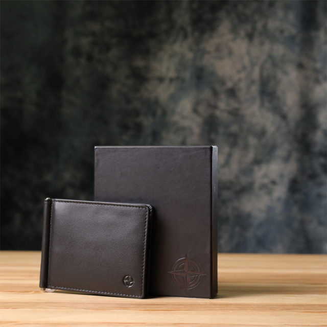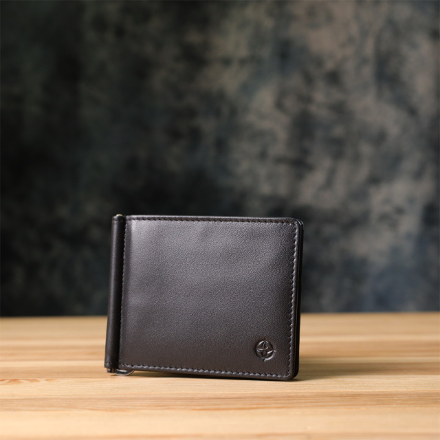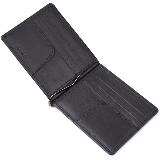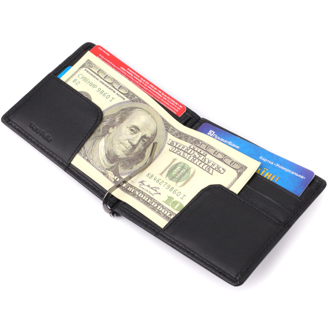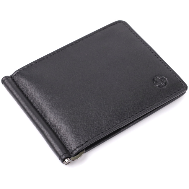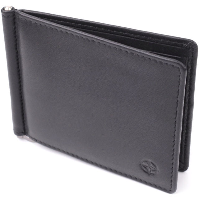 Аксессуар выполнен из натуральной гладкой кожи черного цвета. Внутри предусмотрены восемь слотов для карт и надежный металлический зажим для денег. На лицевой стороне в нижнем правом углу расположен тисненый логотип производителя, подчеркивающий оригинальность и элегантность модели. Дизайн без застежки делает использование удобным и сохраняет компактность.