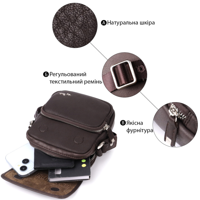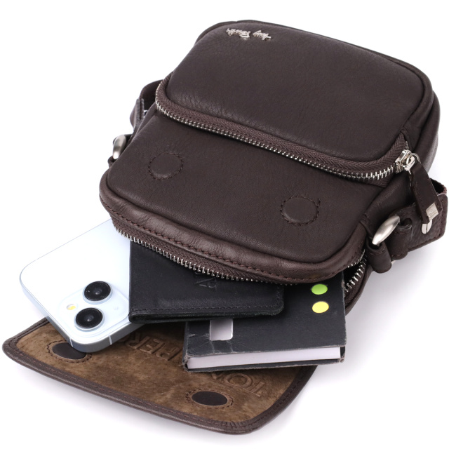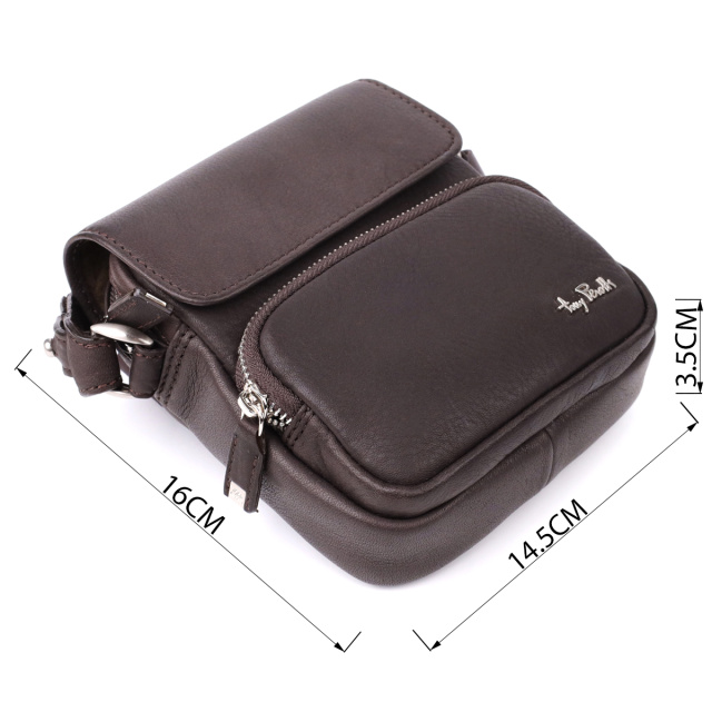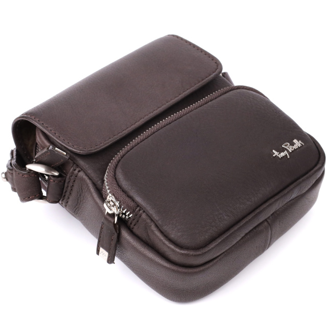 Коричневая кожаная сумка Tony Perotti — это сочетание функциональности, элегантного дизайна и премиального качества. Аксессуар выполнен из натуральной телячьей кожи, приятной на ощупь и устойчивой к износу. Продуманная внутренняя организация позволяет удобно разместить документы, телефон, карты, ручки и мелкие личные вещи. Классический дизайн, фирменный логотип и надёжная фурнитура делают сумку универсальным выбором для современного мужчины и отличной идеей для подарка.