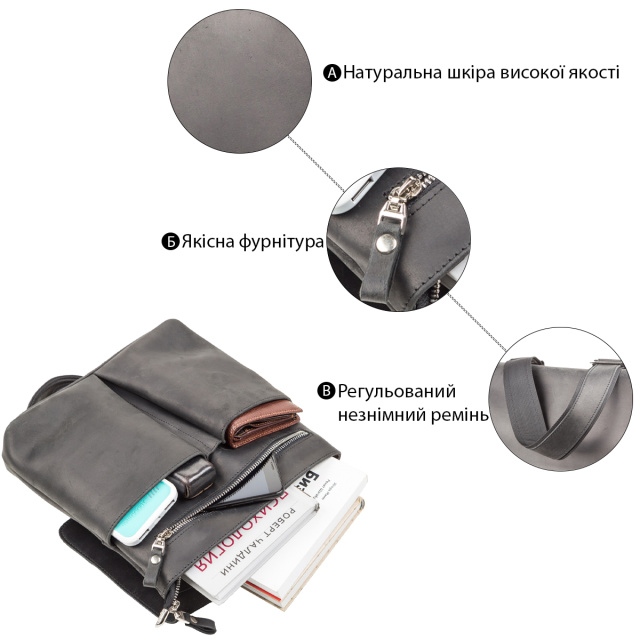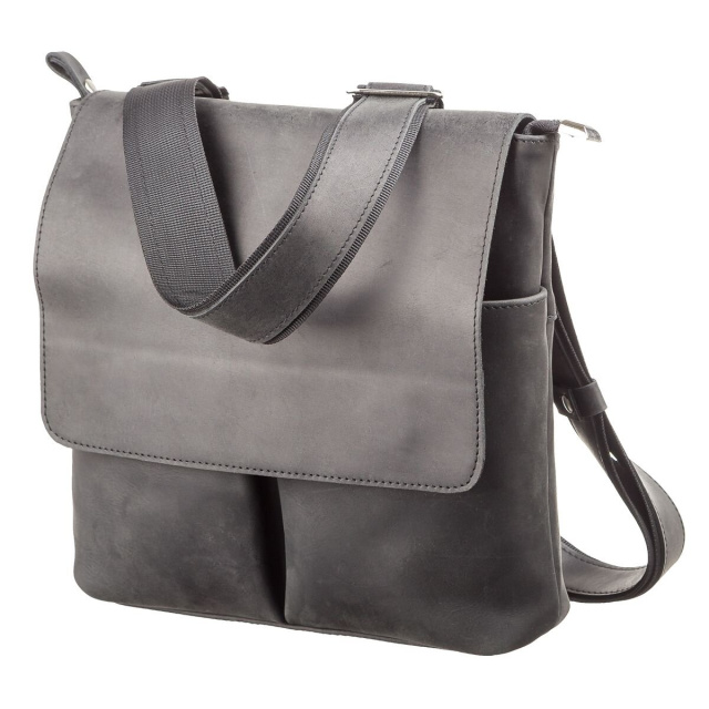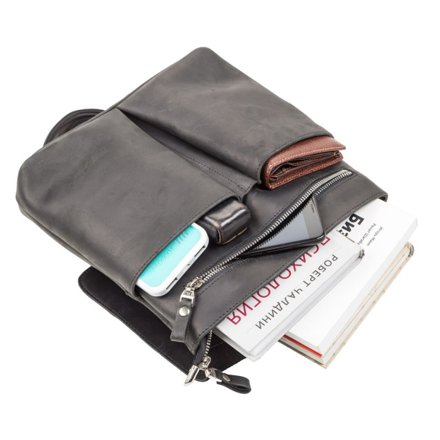Сумка средних размеров из натуральной винтажной кожи для мужчин, которые ежедневно носят с собой много мелких вещей (ключи, телефон, блокнот, портмоне, небольшой планшет, и т.д.). Аксессуар достаточно вместительный для своих размеров, закрывается при помощи клапана на магнитах, для дополнительной защиты вещей на молнию.