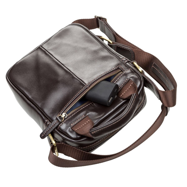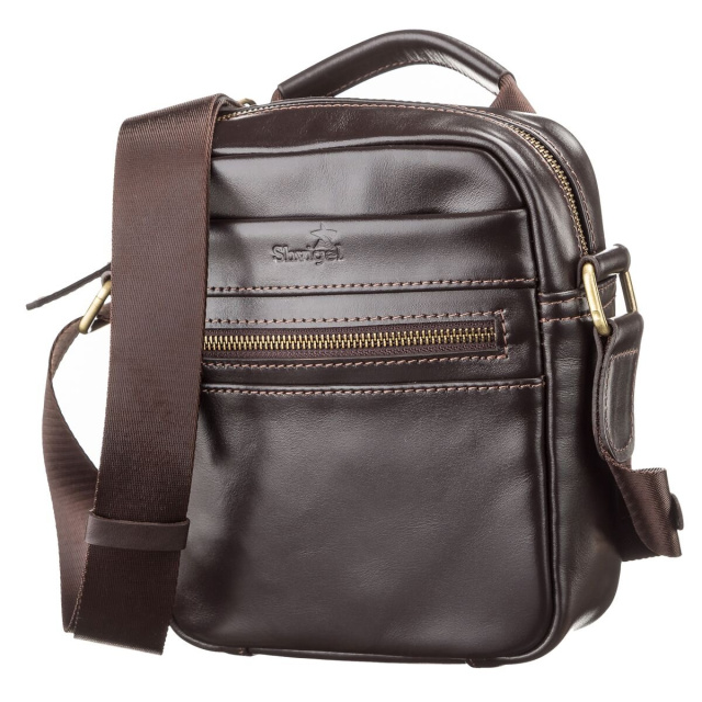 Компактная мужская сумка из натуральной высококачественной гладкой кожи. Аксессуар прошит светлой нитью, что придает изделию прочности и оригинального вида. Данный аксессуар не только функционален в использовании,