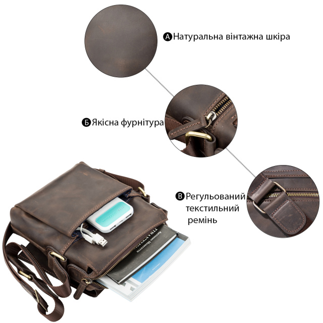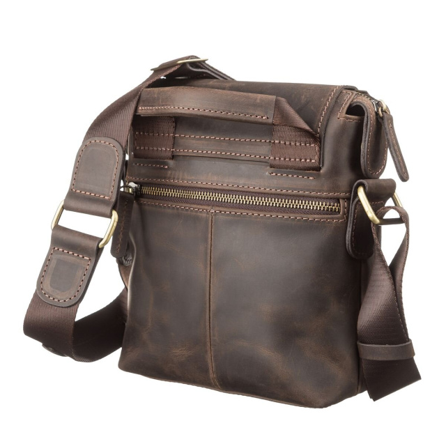 Мужская кожаная сумка небольшого размера с клапаном. Аксессуар выполнен из натуральной винтажной кожи, характерными признаками которой, являются: неоднородность окраса и потертости, которые придают изделию изысканного, индивидуального вида.