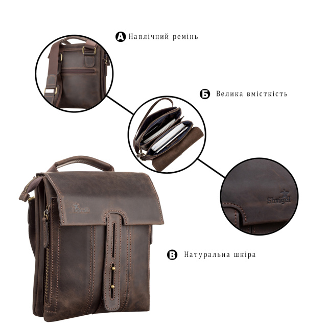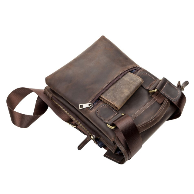 Мужская кожаная сумка-планшет небольшого размера с клапаном и хлястиком. Изделие выполнено из натуральной винтажной кожи, характерными признаками которой, являются: неоднородность окраса и потертости, которые придают изделию изысканного, индивидуального вида. Аксессуар прошит светлой нитью, что придает изделию прочности и оригинального вида. Аксессуар выглядит очень стильно и дорого.