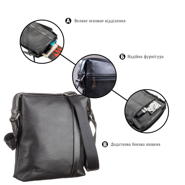 Материал: натуральная кожа; Размеры (ШхВхГ, см): 24.5х28х6.5; Цвет: черный; Страна производитель: Украина. Прочная сумка для стильных и...