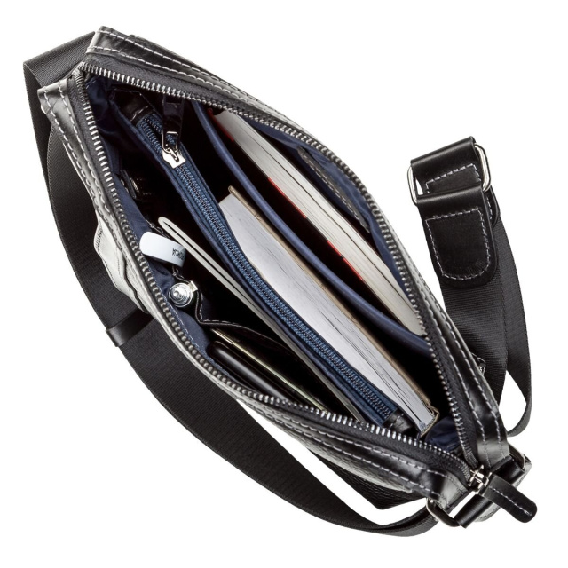 Снаружи: на лицевой стороне вертикальный потайной карман на змейке, на задней стенке - карман на молнии. Подкладка выполнена из прочного синего материала, регулируемый плечевой ремень. Аксессуар упакован в пылезащитный чехол.