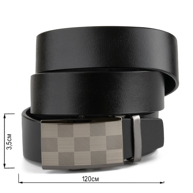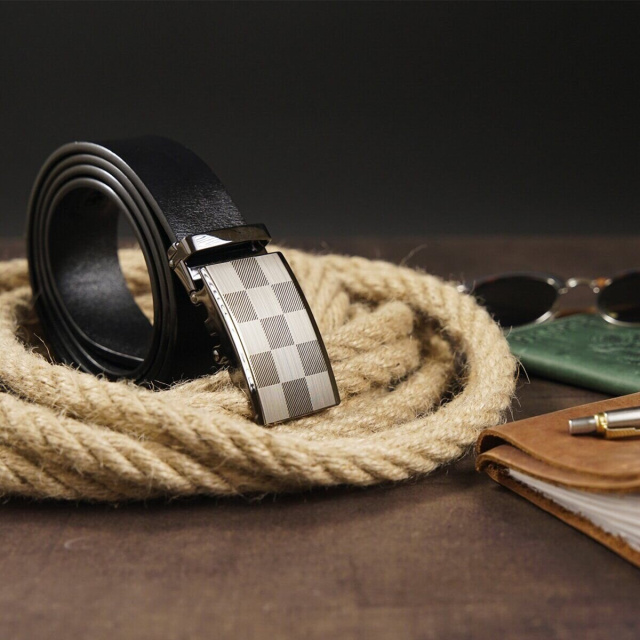Стильный мужской ремень из натуральной кожи высочайшего качества. Выполнен аксессуар из цельного полотна. Дизайн ремня продуман до мелочей и соответствует всем модным тенденциям. Дополнен ремень оригинальной пряжкой из крепкого сплава серебристого цвета и тиснением в виде шахматной доски. Автоматический ремешок очень практичен. Производство - фабричный Китай. Кожаный ремень - лучший выбор для подарка близкому человеку.