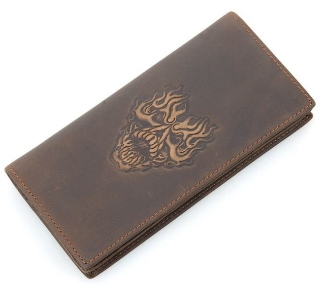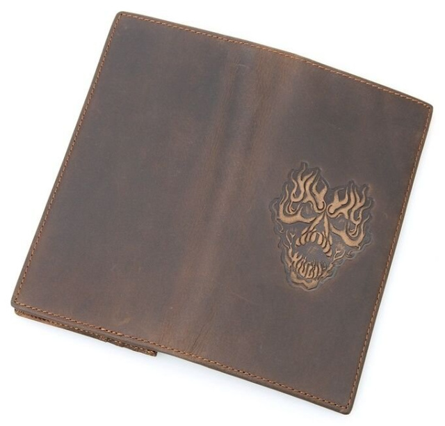 Оригинальный мужской вертикальный бумажник с дизайнерским рисунком на лицевой стороне. Кошелек изготовлен из натуральной высококачественной винтажной кожи, и аккуратно прошит прочной нитью. Данную модель удобно держать в руке. Кошелек не поместиться в кармане джинсов, но даже самые длинные купюры помещаются в нем в развернутом состоянии. Аксессуар упакован в текстильный пылезащитный мешочек белого цвета.