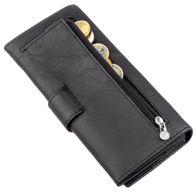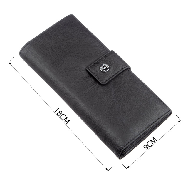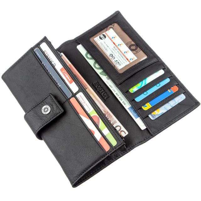 Шикарный женский кошелек из высококлассной натуральной кожи, которая порадует Вас своей мягкой и нежной фактурой. Цвет этого кошелька – черный, который отлично подойдет для прагматичных и деловых женщин любого возраста. В данном аксессуаре есть четыре больших отделения для купюр и документов, отделение на молнии для различных ценностей, карманы для кредитных и визитных карт, а также на тыльной стороне есть отделение для монет или прочих мелочей, которые требуют быстрого доступа к ним. Закрывается кошелек на удобную и практичную кнопку. Упаковано изделие в белую плотную картонную коробку с фирменным логотипом.
