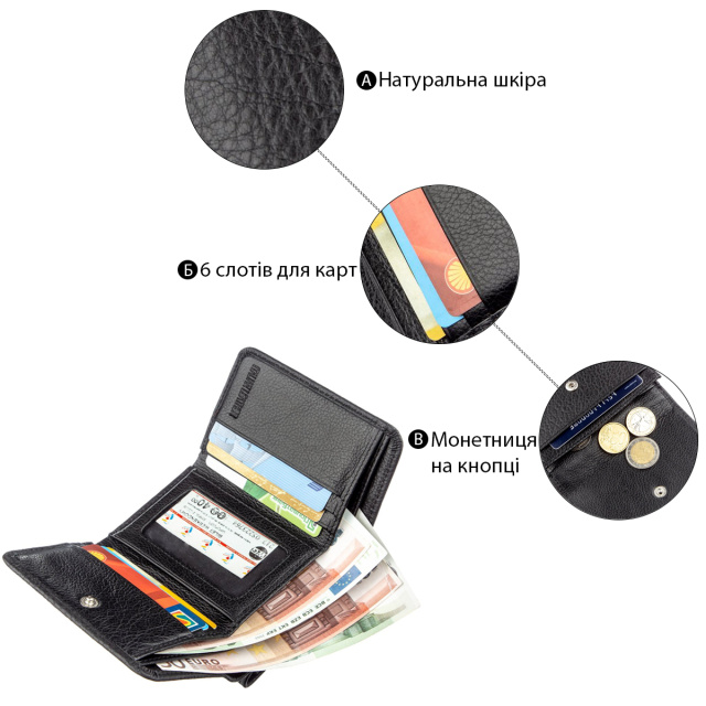 Женский кошелек из высококачественной кожи в самом практичном и универсальном черном цвете. Имеет стильный и красивый дизайн и отлично подойдет для прагматичных людей. Внутреннее наполнение представлено вместительными отделениями для купюр, визитных и кредитных карт, а также для монет и прочих мелочей. Закрывается на кнопки, причем монетница и основное отделение автономно разграничены. Бумажник абсолютно точно может использоваться как аксессуар для женщин и мужчин. Упакован кошелек в плотную картонную коробку белого цвета.