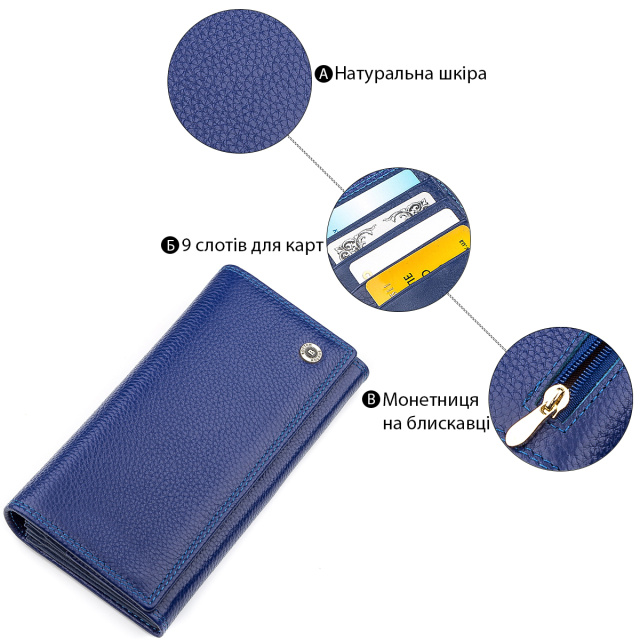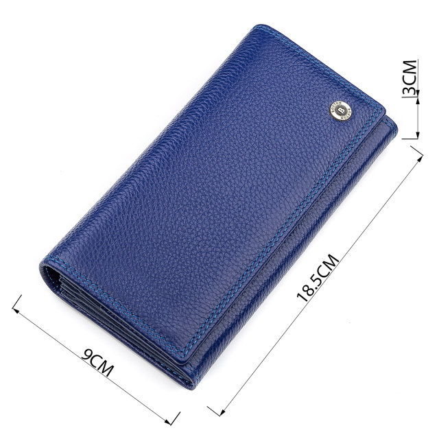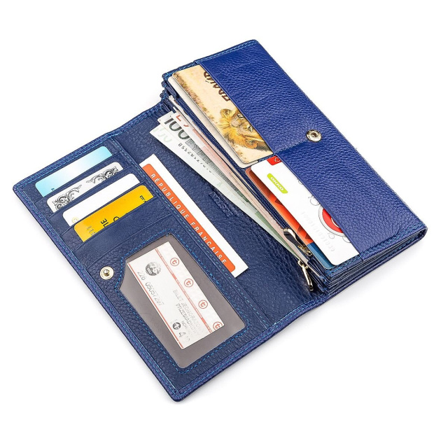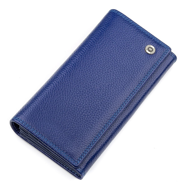 Привлекательный кошелек для женщин выполнен с качественной, натуральной и экологической кожи, которая приятна на ощупь и достаточно долговечна. По нижнему краю прошита двойная фирменная строчка, которая подходит основному цвету – синему, дополняя и выделяя его отличный дизайн. На лицевой стороне расположен брендовый значок золотистого оттенка, а упакован кошелек в красивую коробку, которую можно использовать в качестве подарочной.