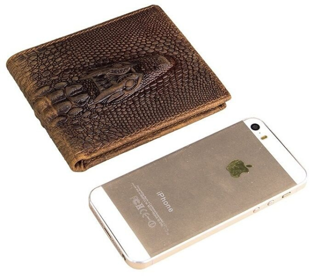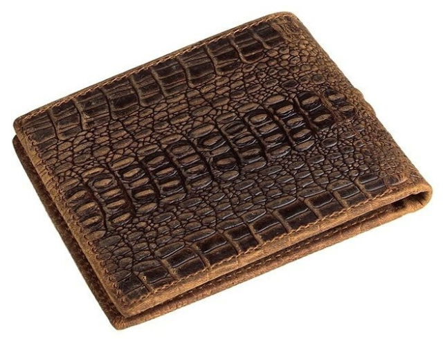 Шикарный мужской бумажник из кожи с фактурой под крокодила. Кошелек имеет компактные размеры и с легкостью помещается в карман джинсов. Аксессуар прошит сверхпрочной нитью светло-коричневого цвета. Данная модель поставляется в текстильном пылезащитном чехле.