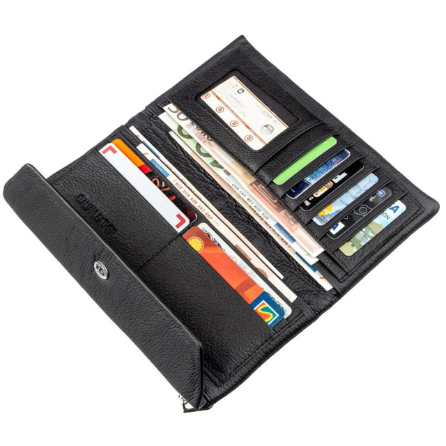 Незаурядный женский клатч на все случаи жизни из натуральной кожи. Выполнен в черном цвете, благодаря чему, подойдет под любой гардероб своей хозяйки. Вас обязательно удивит высокое качество данного аксессуара, а значит, он прослужит Вам очень долго. В данный кошелек-клатч поместится все необходимое, от денежных купюр до кредитных карточек. На тыльной стороне расположен карман на молнии для монет или других ценных мелочей, что очень удобно и практично. Вы можете приобрести изделие, как для себя любимой, так и на подарок близкому человеку. В любом случаи владелица кошелька останется довольной. Упакован клатч в фирменную коробку белого цвета из картона.