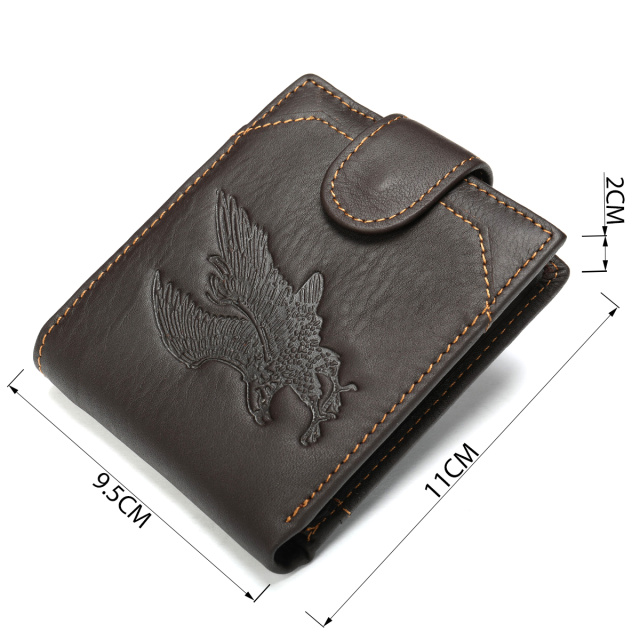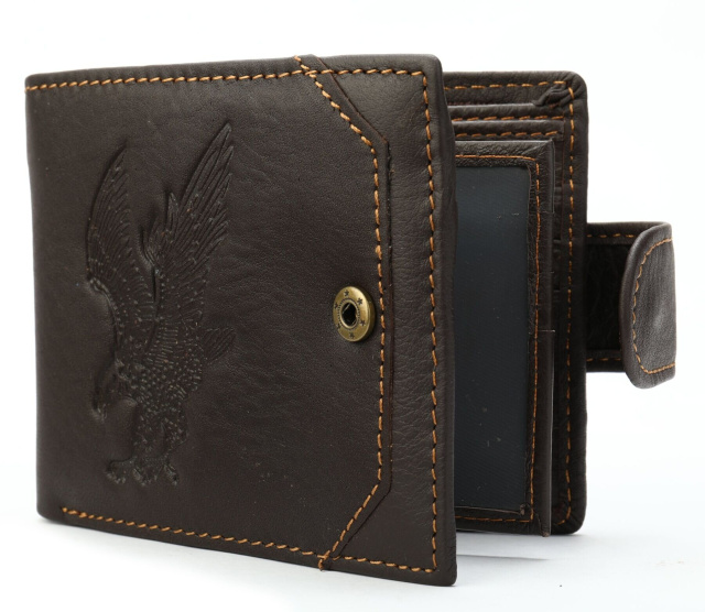 Стильное мужское портмоне из натуральной кожи, которое с легкостью поместится в карман брюк. По краям модель прошита светлой нитью и дополнена тисненным орлом. Закрывается портмоне на кожаный хлястик с кнопкой. Изделие имеет весь самый необходимый функционал. Портмоне очень вместительное. Аксессуар дополнен исключительно качественной фурнитурой. Мы уверены, что портмоне прослужит вам далеко не один год и станет прекрасным подарком для любого мужчины.