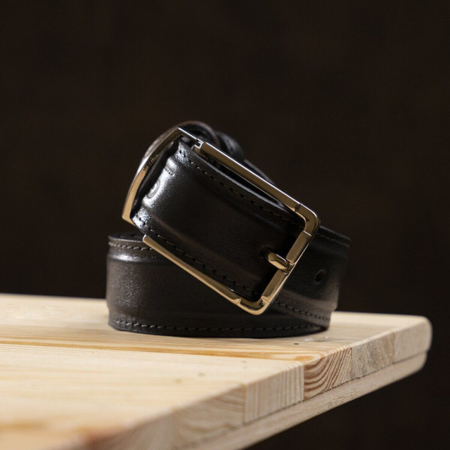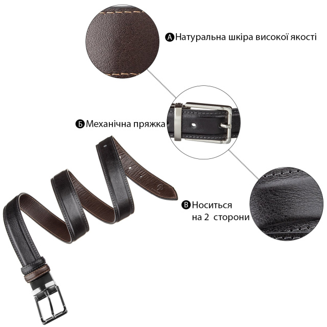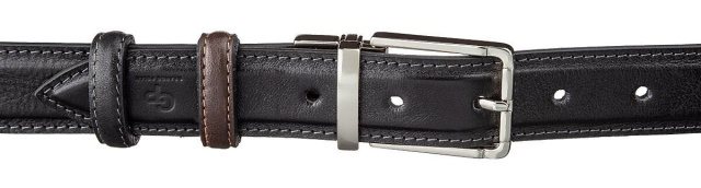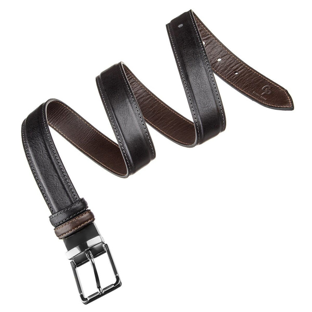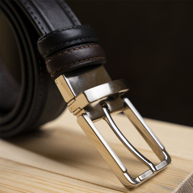 Модный ремень из цельной итальянской кожи. Уникальной особенностью такого ремня является то, что вы можете носить его любой стороной или черной или коричневой. Этот ремень соединяет в себе 2 цвета в одном. Ремень прошит по краям ровной строчкой серого и рыжего цвета. Такой аксессуар просто находка для тех, кто не хочет покупать 2 ремня разных цветов. Производитель, использует исключительно импортную фурнитуру, которая не темнеет, не царапается и не вызывает аллергии. Такой кожаный ремень всегда дополнит гардероб как молодого, любящего себя человека, так и будет дополнением к образу солидного мужчины.
