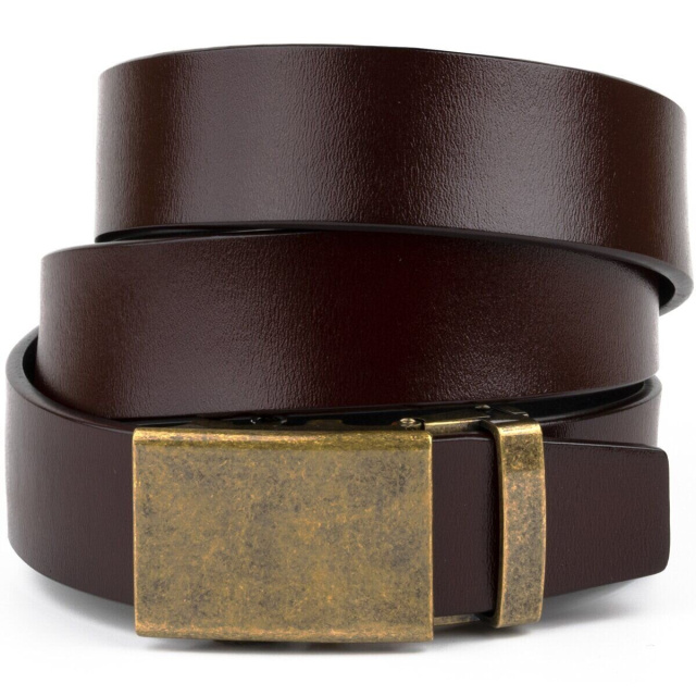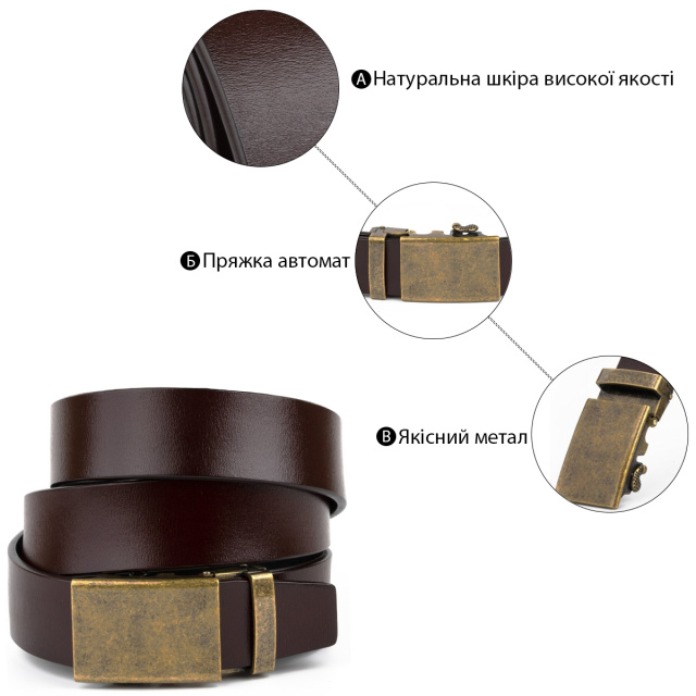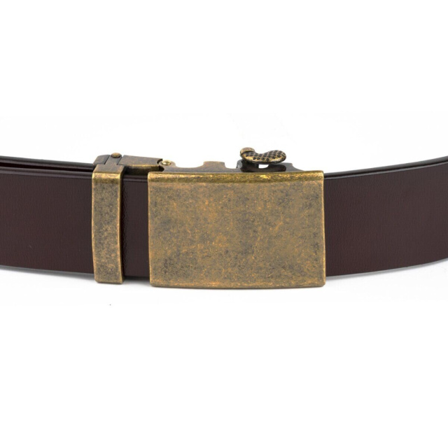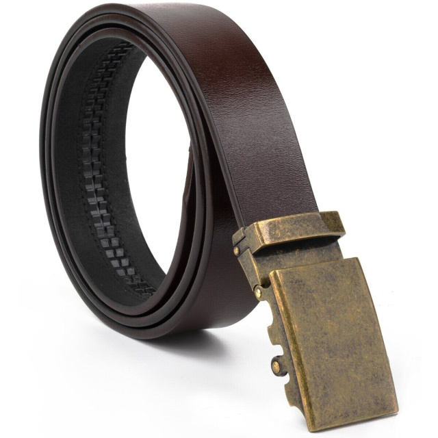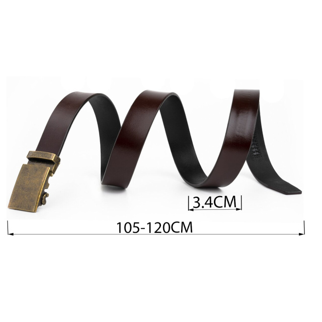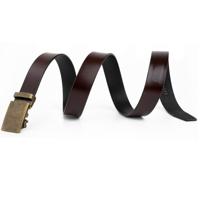 Коричневый, классический ремешок с автоматической пряжкой цвета латуни. Пряжка изготовлена из качественного сплава и смотрится очень дорого и оригинально. Ремень подойдет для вас, если вы в поисках солидного аксессуара, который подчеркнет ваш статус в обществе и чувство стиля. Плотная кожа, выдержанный дизайн в сочетании с крепкой пряжкой делают модель особенно привлекательной. Подбирайте подарочную упаковку и приобретайте данный ремень на подарок для вашего мужчины. Уверены, что такой подарок доставит только положительные эмоции.