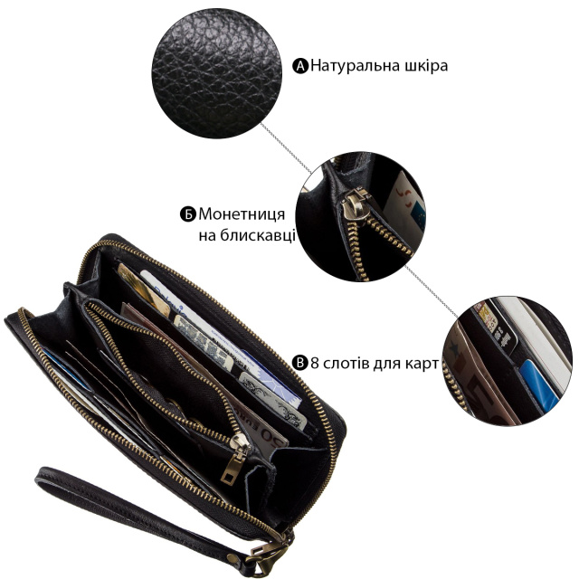 Материал: натуральная кожа; Размеры (ШхВхГ, см): 22х11,5х2; Цвет: черный; Страна производитель: Украина. Описание: - два больших открытых...