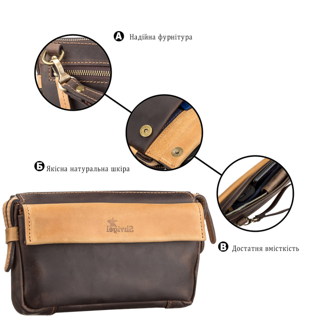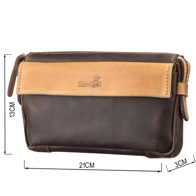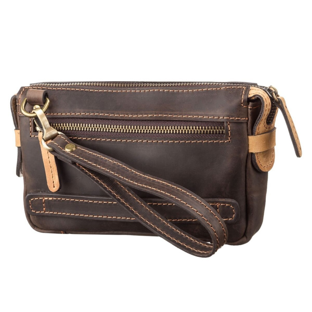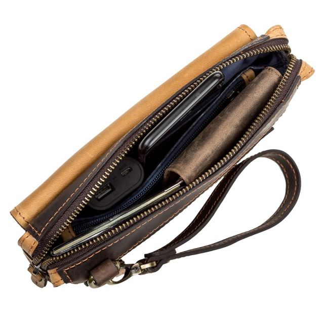 Вместительная мужская сумка-клатч из натуральной высококачественной винтажной кожи, особенностью, которой есть потертости и неоднородность окраса. Аксессуар прошит светлой коричневой нитью, что придает изделию прочности и оригинального вида. Данный аксессуар не только функционален в использовании, но и дополняет, и подчеркивает деловой, элегантный образ современного мужчины.