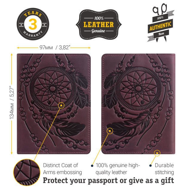 Дизайнерская обложка на паспорт из натуральной кожи. Рисунок на лицевой стороне изделия сделан в стиле индейского талисмана Ловца Снов (dreamcatcher). Внутри обложки Вы найдете тесненный логотип компании-производителя SHVIGEL. Обложка на паспорт поставляется в фирменном текстильном мешочке.