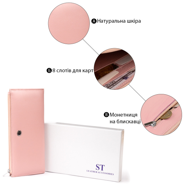 Женский кошелек нежно-розового цвета. Изделие добавит вам легкости. Аксессуар тонкий и компактного размера. Легко поместится в сумочку и удобно лежит в руке. Качественный кошелек будет по душе любой девушке. Выглядит очень модно и стильно. Дизайн кошелька продуман до мелочей. Прослужит такой кошелек вам далеко не один год. На нашем сайте модель доступна в разных цветах. Рекомендуем вам данный кошелек, если вы находитесь в поиске подарка.
