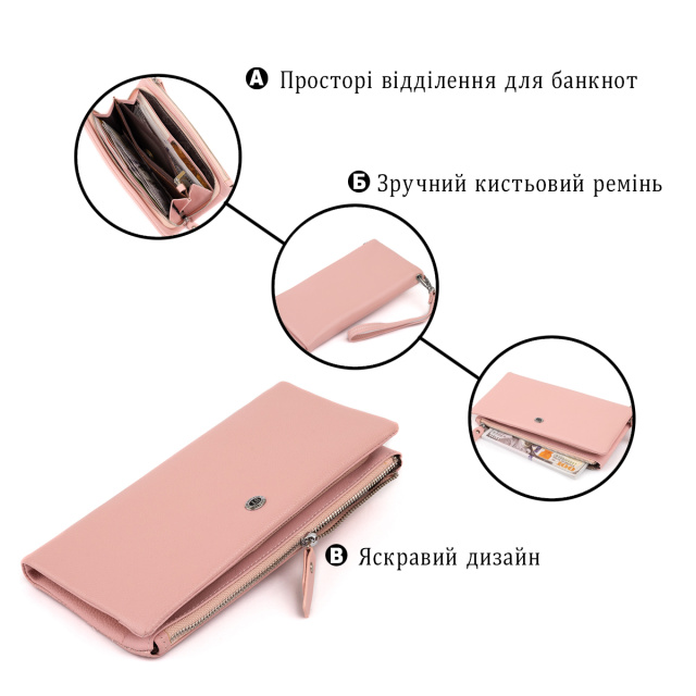 Перед вами кошелек-клатч из новой коллекции. Нежный розовый цвет будет по душе любой девушке и добавит легкости в ее гардеробе. Аксессуар - незаменимая вещь для современной девушки. Клатч очень вместительный, ведь в нем есть даже отделение для мобильного телефона. Изделие выполнено исключительно из натуральной кожи с ее природной текстурой и легким запахом. Внутри - аксессуар из плотного текстиля. Внутренние карманы просторные и вы с удобством разместите купюры, карты, монеты и другие личные мелочи. Заказывайте у нас по самым доступным ценам. Кошелек прослужит вам долгое время.