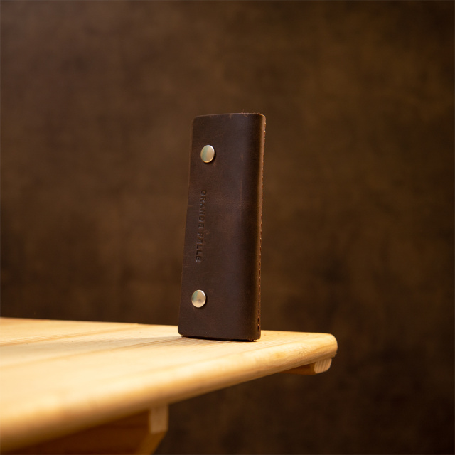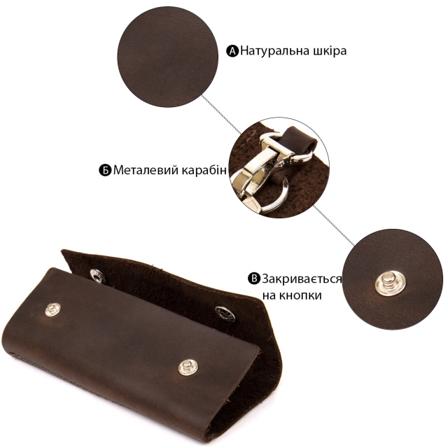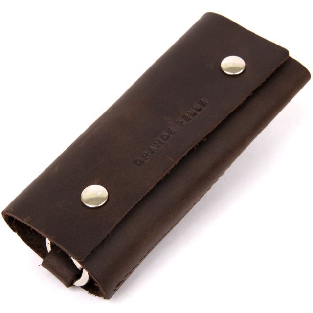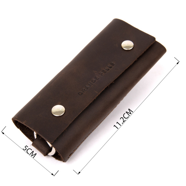 Материал: натуральная кожа. Цвет: коричневый. Размеры (ШхВхГ, см): 5х11,2 см. Страна производитель: Украина. Бренд: GRANDE PELLE. Описание: - закрывается на две металлические кнопки; - внутри надежное металлическое кольцо-даржатель и карабин серебреного цвета; Универсальная винтажная ключница из натуральной кожи высокого качества. Закрывается на две металлические кнопки, что очень удобно и практично. Цвет фурнитуры – серебро. Смотрится стильно и дорого. Упаковка представлена в виде фирменного чехла.