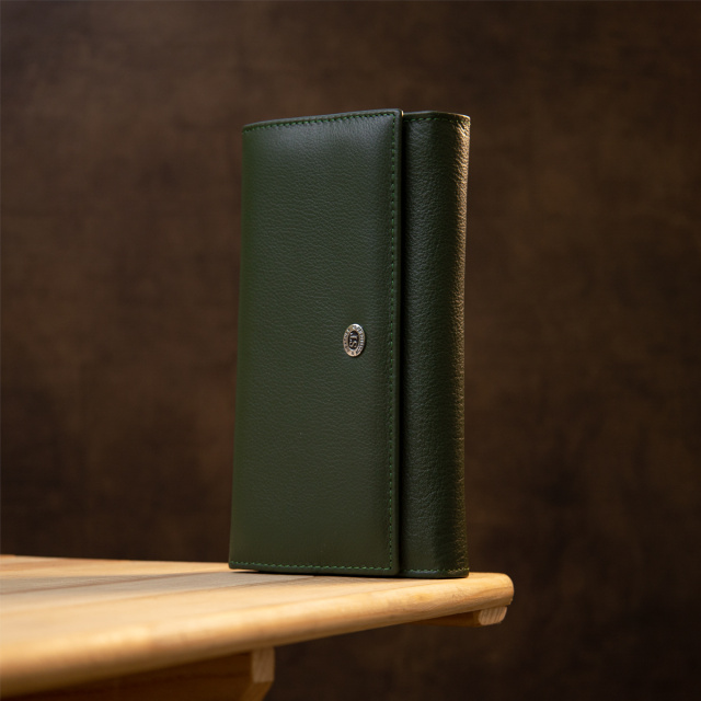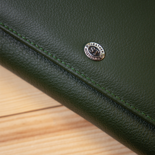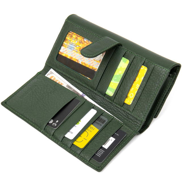 Материал: натуральная кожа. Цвет: зеленый. Размеры (ШхВхГ, см): 19х10х3 см. Страна производитель: Китай. Бренд: ST Leather. Описание: - основное отделение закрывается на два магнита; - внутри расположено четыри больших отделения для купюр по всей длине; - одно отделение на всю длину для прочих ценных вещей; - 2 отделения на молниях; - 4 карманов для карточек; - на внешней стороне размещены слоты для карт 10 шт; - отделение на всю длину кошелька; - прозрачный кармашек; - слоты закрываются на хлястик с кнопкой, которая регулирует объём его наполнения; Красивый женский кошелек в темно-зеленом цвете. Изготовлен из натуральной мягкой кожи с зернистой фактурой. Наполнение очень практичное и отвечает всем требованиям современной жизни. Также это отличный вариант для тех, кто носит с собой много карточек или визиток. Все швы аккуратно и надежно прошиты и имеют такой же зеленый цвет. Это отличный выбор для женщин любого возраста.