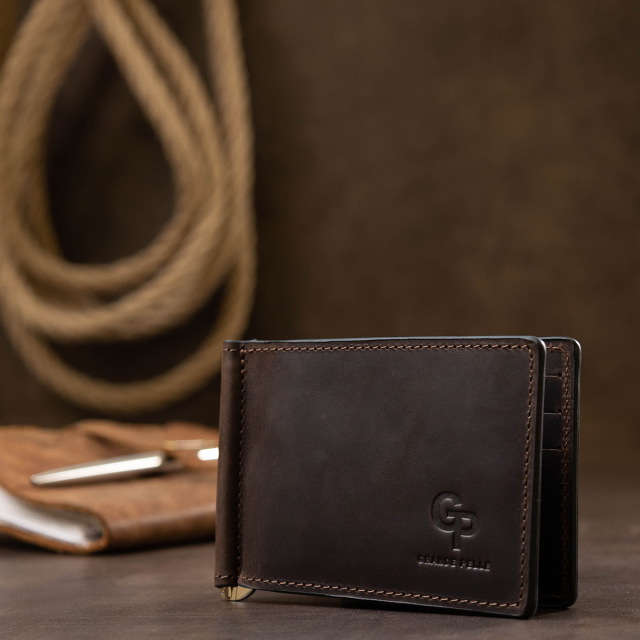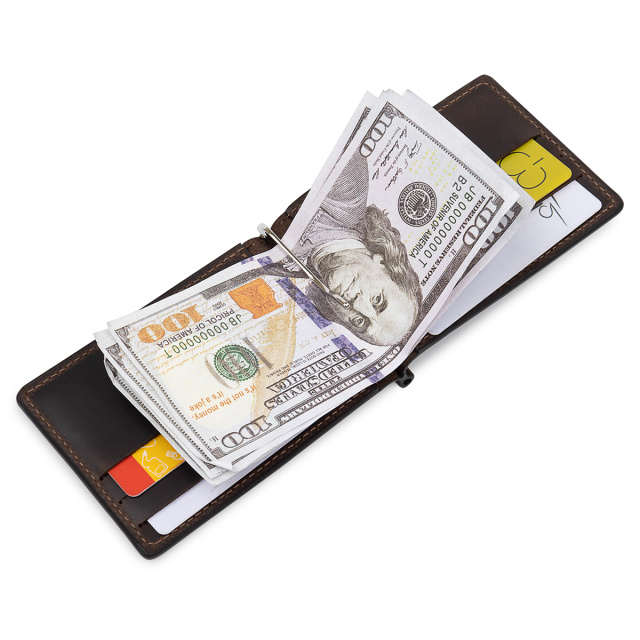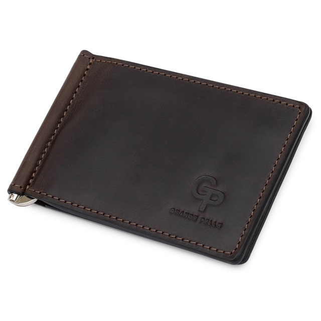 Красивый мужской зажим для денег в шоколадном цвете, что смотрится очень стильно. Материал изготовления – натуральная кожа с отменными эксплуатационными характеристиками. В такой зажим можно положить не только купюры, но и различные карточки, что очень удобно и практично.