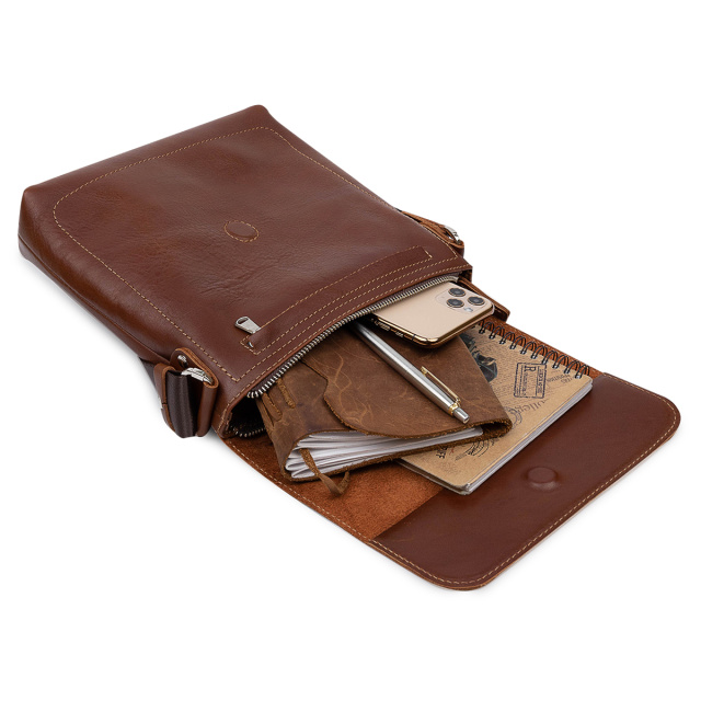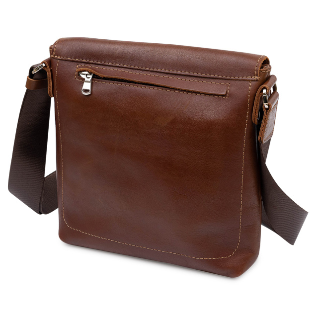 Добротная мужская сумка из высококачественной натуральной кожи. Имеет гладкую глянцевую фактуру и красивый коричневый цвет. Внутри есть вместительное отделение на молнии и кармашек для телефона. На задней и передней внешних сторонах есть карманы на молнии. Упакована сумка в фирменный чехол.