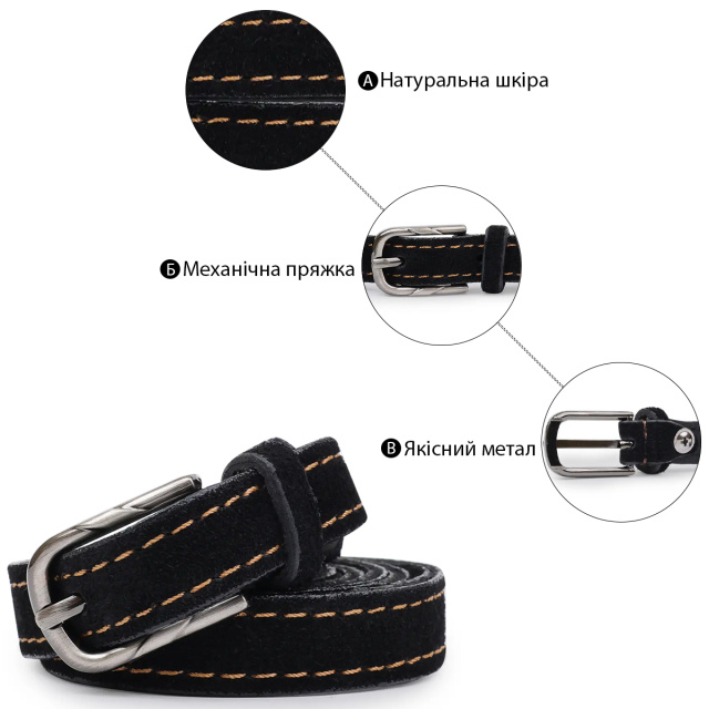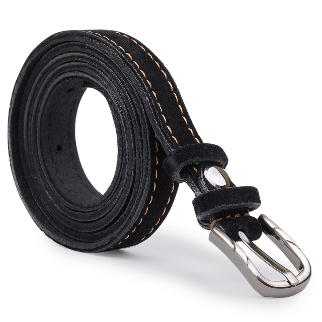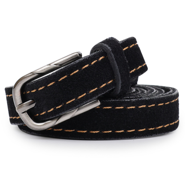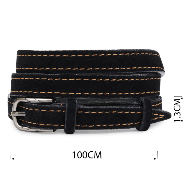 Красивый замшевый ремень в черном цвете с коричневыми строчками по бокам, что смотрится очень модно и стильно. Выполнено изделие из натуральной кожи, которая устойчива к повреждениям и износу. Пряжка сделана в классическом стиле, что очень удобно и практично.