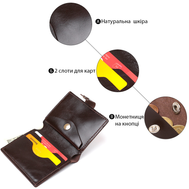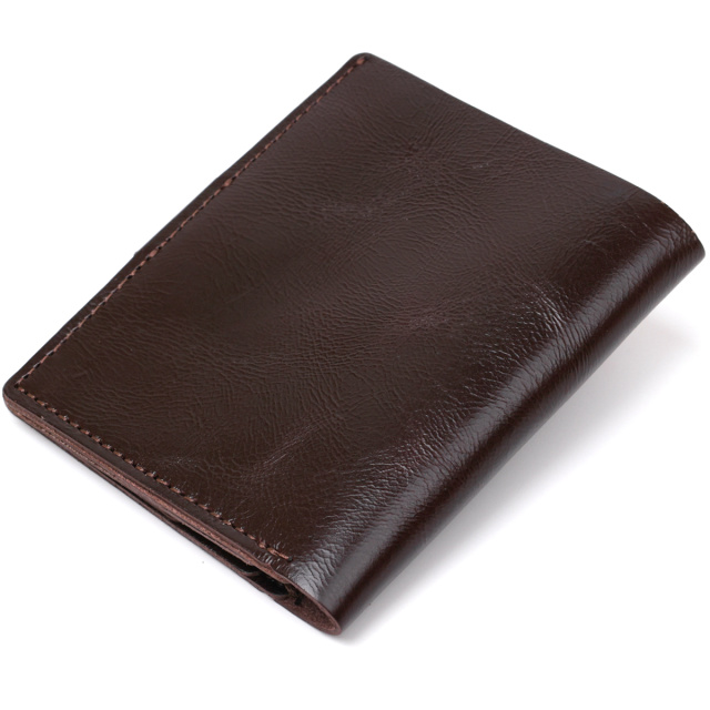 Стильное мужское портмоне от украинского производителя в сдержанном классическом дизайне. Изготовлен кошелек из натуральной кожи высокого качества и повышенной сопротивляемости к износу. Внутри есть вместительное отделение для купюр, слоты для пластиковых карточек и небольшая монетница на кнопке. Цвет аксессуара – коричневый с легким переливом, фактура – гладкая.