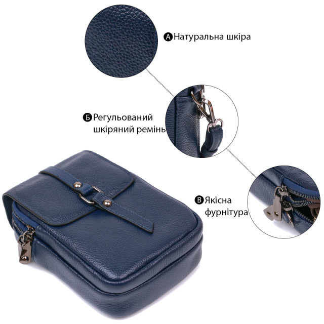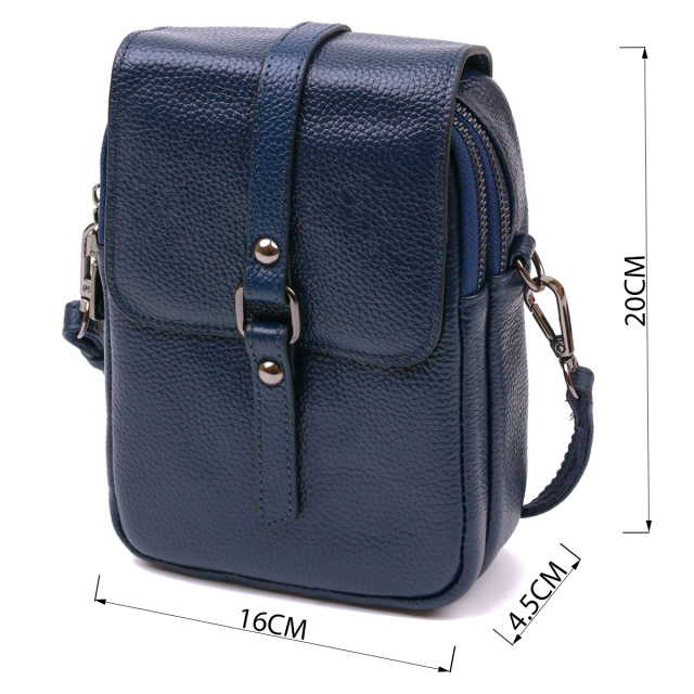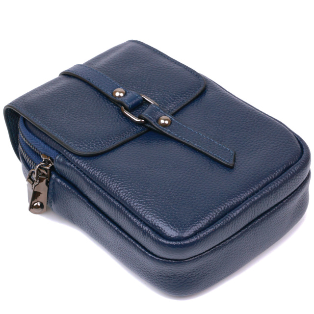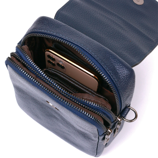 Необычная синяя сумка из качественной зернистой натуральной кожи, мягкой и приятной на ощупь. Изделие имеет достаточно отделений. Качество изделия очень высокое. Торчащие нитки отсутствуют, крепкая фурнитура и плотная подкладка. Данная модель станет прекрасным подарком для любого мужчины. В комплекте идет пылезащитный чехол.