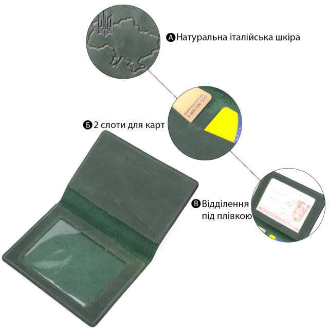 Практичная обложка зеленого цвета для военного билета с патриотическим тиснением карты Украины, на лицевой стороне. Изделие пошито с качественной гвинтажной итальянской кожи с высоким показателем износостойкости, которая защитит от повреждений документ на очень долгое время. Аксессуар имеет разворот для военного билета, две ячейки для карточек, без застежки, упакован в фирменный чехол.