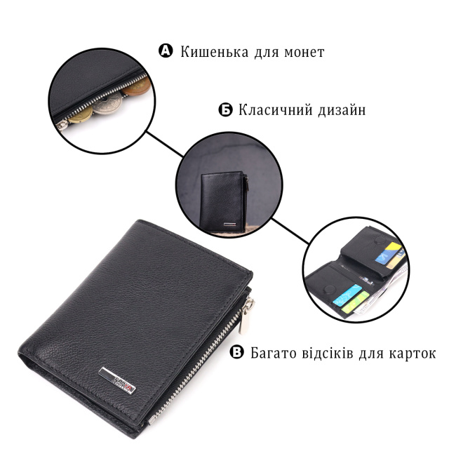 Превосходный компактный кошелек из натуральной кожи высокого качества, изделие классического черного цвета. Внутри есть отделение для купюр, десять ячеек для кредитных карт, монетница на молнии и четыре скрытых кармана. В изделии использована качественная фурнитура, а также прочная фирменная подкладка. Закрывается модель в два сложения на кнопку.