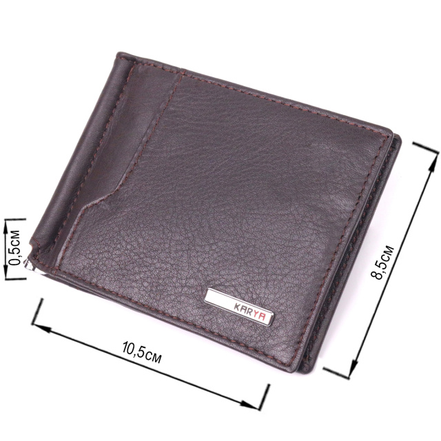 Практичный мужской зажим из натуральной кожи, в коричневом цвете. Изделие закрывается в два сложения на магнит. Зажим состоит из металлического держателя для купюр, трех ячеек для кредитных карт, трех прилегающих карманов, отделения под сеточкой и монетницы, что закрывается на молнию. Аксессуар упакован в фирменную коробочку. Изделия из натуральной кожи всегда будут отличным подарком для близкого человека.