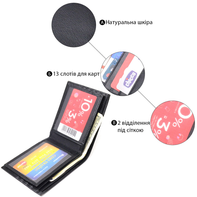 Стильный  мужской кошелек из натуральной гладкой кожи. Аксессуар имеет два отделение для купюр, в которые помещаются купюры всех номиналов, два прилегающих кармана, а также тринадцать отсеков для карточек, один из них под сеточкой. В современном мире кожаное портмоне является просто необходимой вещью, а качественное кожаное портмоне является еще и неплохим вложением денег, так как прослужит не один год.