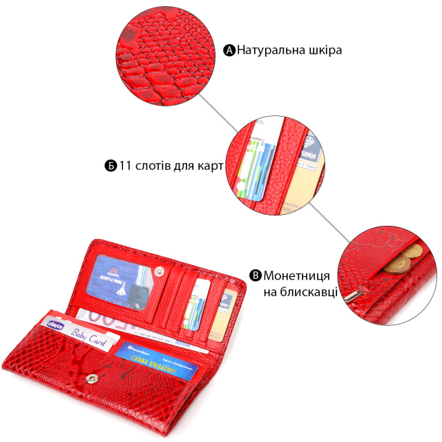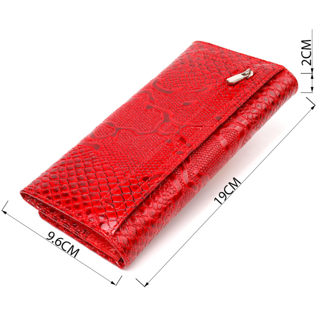 Лакированный фактурный женский кошелек, из натуральной кожи, с тиснением под рептилию. Аксессуар имеет три основных отделения, в которые помещаются купюры всех номиналов, две перегородки, одна из них на молнии, одиннадцать карманов для карточек, один из которых под сеточкой, монетница на молнии - снаружи и один прилегающий карман. Закрывается аксессуар клапаном на кнопку. Отличный аксессуар, надежного производителя, который прослужит очень долго.