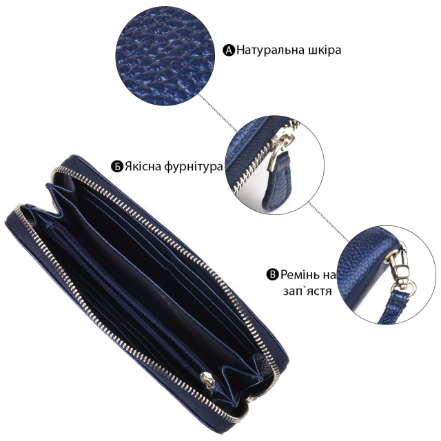 Оригинальный женский кошелек, из натуральной кожи. Аксессуар имеет три основных отделения, в которые помещаются купюры всех номиналов, две перегородки, одна из них на молнии, восемь карманов для карточек, два прилегающих кармана и съемный кистевой ремень. Закрывается аксессуар на молнию. Отличный аксессуар, надежного производителя, который прослужит очень долго.